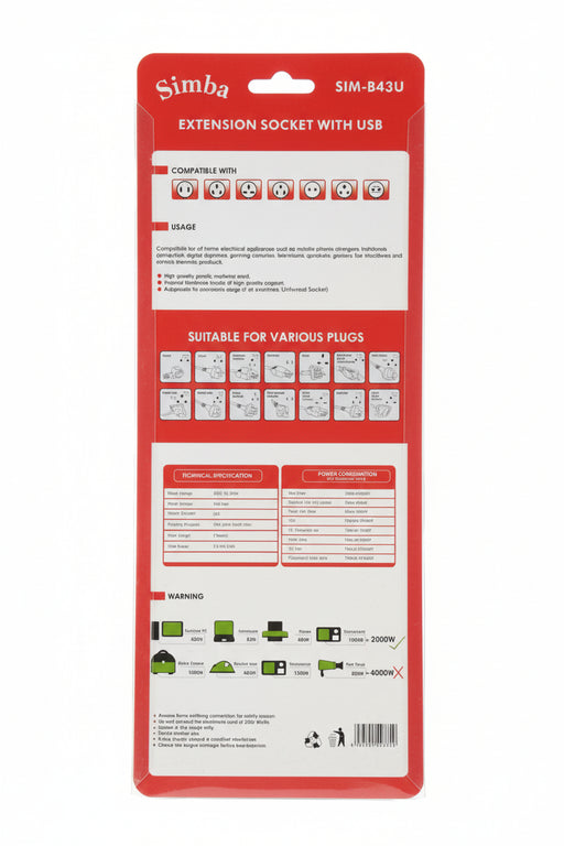 Murukali.comThe Simba Super Extension Socket SIM-B43U features 4 universal AC outlets and 3 USB ports, allowing multiple devices to be powered at once. It incl...