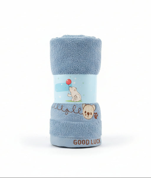 View full detailsBlue Cotton Face & Hand Towel with Cartoon Bear Embroidery – “GOOD LUCK”
