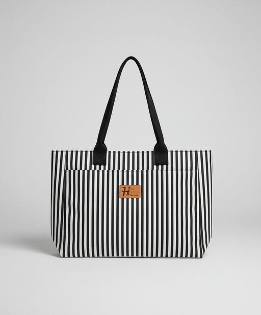 Elegant and roomy tote bag with classic black-and-white vertical stripes. Features strong handles, a front pocket, and durable fabric—perfect for s...