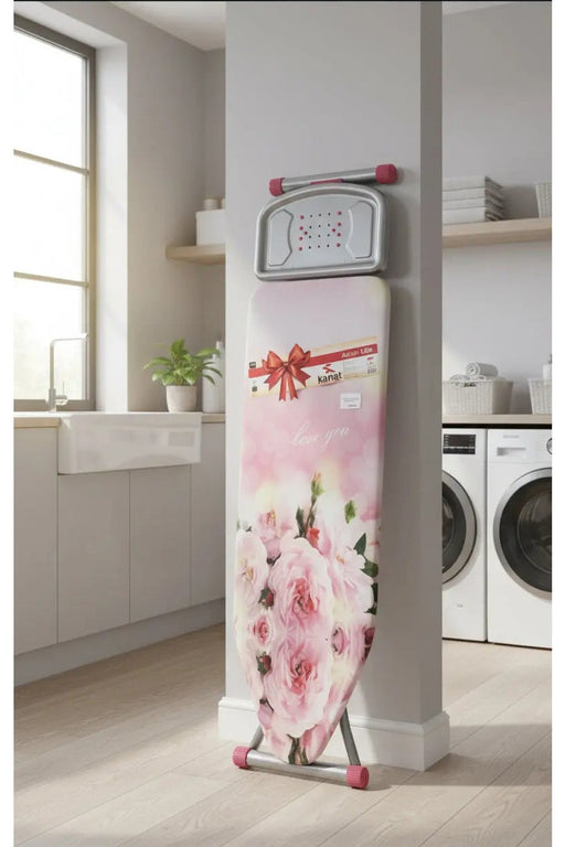 Murukali.comA sturdy and foldable Kanat ironing board featuring an adjustable height, padded surface, heat-resistant iron rest, and a stylish pink rose cover—p...