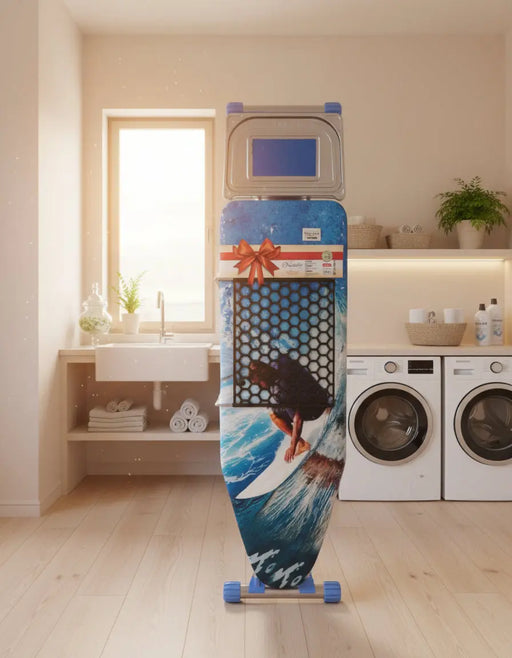 Murukali.comThis Kanat Folding Ironing Board brings a bold and modern look to your laundry space with its unique surfer-themed cover. Featuring a dynamic surfi...