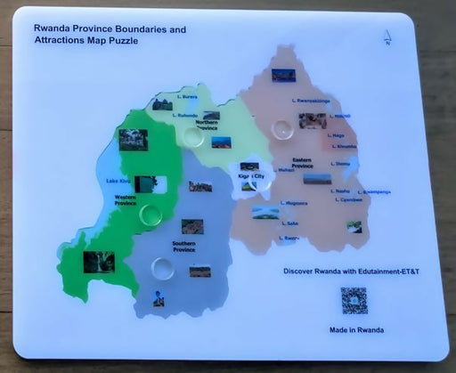 Edutainment RwandaThis the second edutainment Rwanda Map Puzzle. It is an acrylic 5-piece Rwanda provinces map puzzle paired with a QR-based digital learning platfor...
