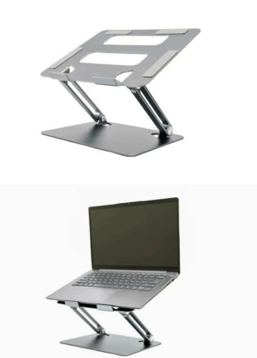 PRINCE ALPHA DECORThe image shows a metallic laptop stand designed to improve ergonomics and comfort while using a laptop. It features adjustable height and angle se...