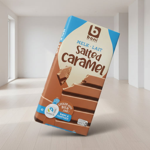 Murukali LTDBoni Selection Melk • Lait Salted Caramel is a premium, large-format milk chocolate bar that offers a perfect balance of creamy sweetness and savor...
