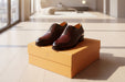 These Premium Two-Tone Brown Oxfords are crafted with a high-shine leather upper, featuring a polished cap-toe and a contrasting pebble-grain texture on the side panels. The elegant burgundy-brown finish includes dark burnished accents at the toe and heel for a sophisticated look. Designed with a traditional five-eyelet closed lacing system, these shoes provide a secure, formal fit. Available in sizes 40 to 45, they offer a refined aesthetic suitable for professional and ceremonial occasions.