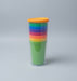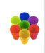 Brightly stacked reusable plastic cups in a clear container with an orange lid. Perfect for picnics, parties, or everyday use. Easy to store and fun for all ages.