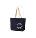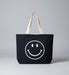Stylish black canvas tote with beige handles and a cheerful smiley print. Perfect for everyday vibes and playful looks.