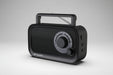 This black, retro-style portable radio is designed for high-quality reception and versatile use. It features a large, easy-to-use tuning knob and a telescoping antenna to ensure a clear signal for both AM and FM stations. Beyond traditional radio, the device functions as a Bluetooth speaker, allowing you to stream music wirelessly from your phone or tablet. For power, it can be plugged into a wall outlet or run on batteries, making it perfect for the kitchen, bedside, or outdoor trips. It also includes a dedicated headphone jack for private listening.