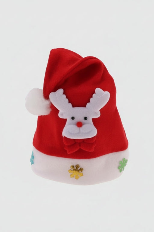 Murukali.comBright red Christmas hat with a cute reindeer face, fluffy pom-poms, and colorful floral accents—perfect for holiday fun.
