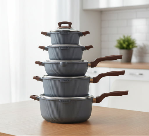 Murukali.comDonnor Aero granite nonstick cookware set made from die-cast aluminum, featuring multiple casseroles and a deep frying pan. Designed for even heati...