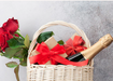 Gift basket with Wrapped Crackers, a bottle of champagne, and bunch of roses